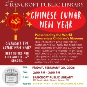 This interactive program allows participants to study the traditions and customs of Chinese Lunar New Year, learn some mandarin phrases, and create an authentic make and take project. Kids learn through hands-on stations and try on authentic clothes!