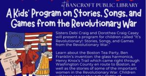 Sisters Debi Craig and Dorothea Craig Casey will present a program for children called “It’s Revolutionary!: Stories, Songs, and Games from the Revolutionary War.”