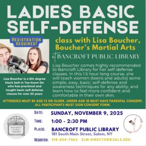 Lisa Boucher or Boucher Martial Arts comes highly recommended to Bancroft Library for her self-defense classes. In this 1.5 hour long course, she will teach women (teens and adults) some of the best ways to protect yourself from physical assault or attack. Attendees must be age 13 or older. Under age 18 must have parental consent. All participants must sign a consent form.